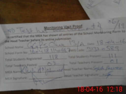 | EMIS Code: 31320589 | Name of School: GGPS CHAK NO.13/A | |||