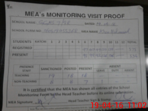 | Attendance Register | Head Teacher | MEA with School | Visit Proof |