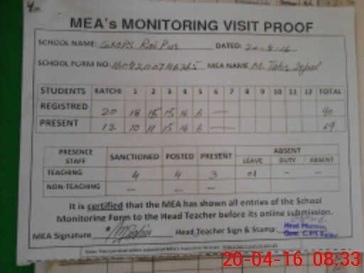 | Attendance Register | Head Teacher | MEA with School | Visit Proof |