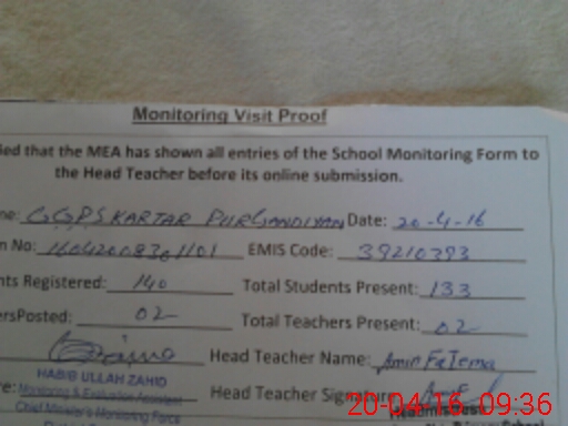 | Attendance Register | Head Teacher | MEA with School | Visit Proof |