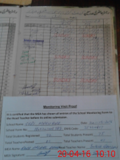 | Attendance Register | Head Teacher | MEA with School | Visit Proof |