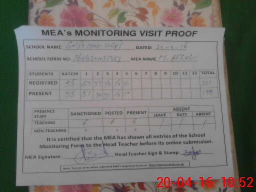 | Attendance Register | Head Teacher | MEA with School | Visit Proof |
