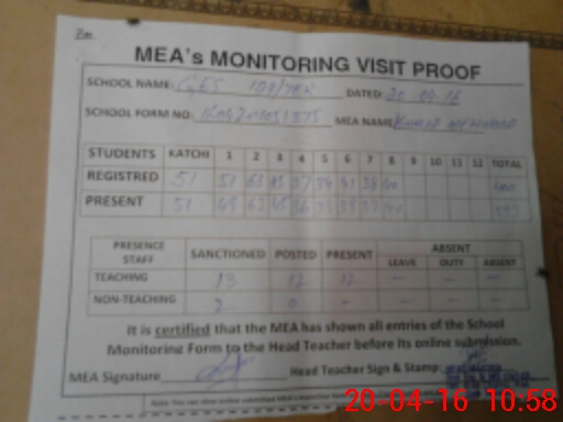 | Attendance Register | Head Teacher | MEA with School | Visit Proof |