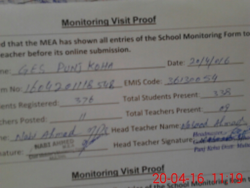 | Attendance Register | Head Teacher | MEA with School | Visit Proof |