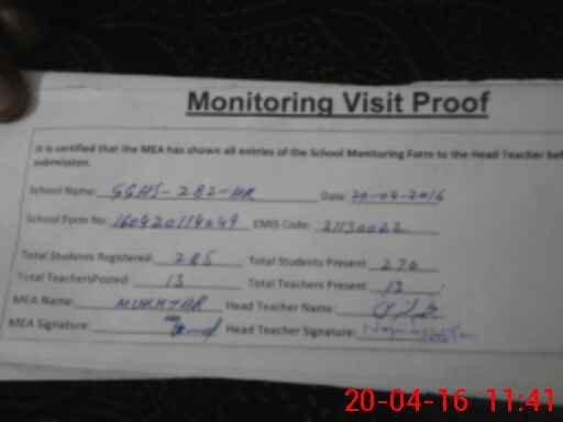 | EMIS Code: 31130022 | Name of School: GGHS CHAK NO 282 HR | |||