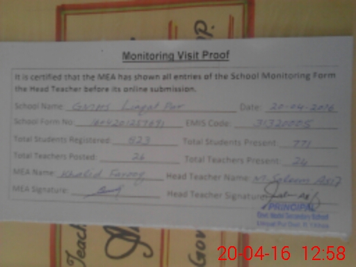 | Certified that this School was Inspected by the Undersigned MEA/DMO Today and the Information Stated Above is as Per Record. | |||||