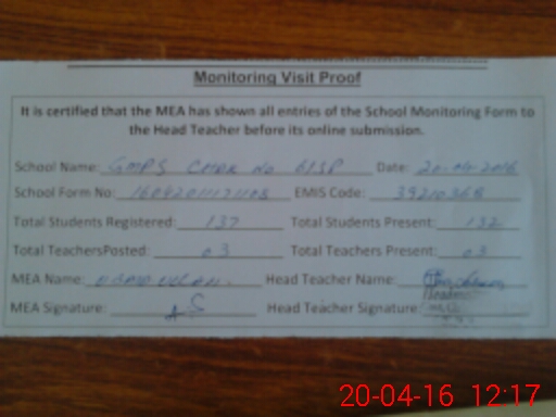 | Attendance Register | Head Teacher | MEA with School | Visit Proof |
