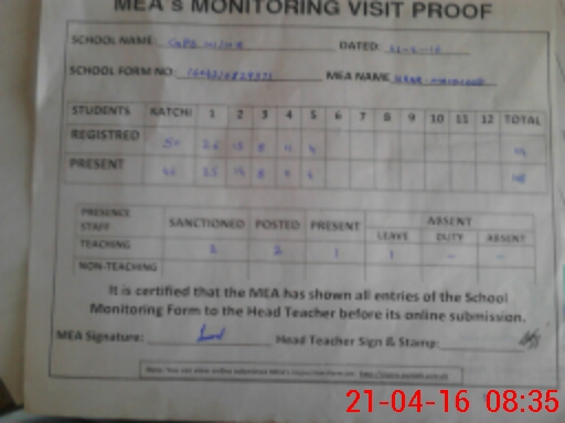 | Attendance Register | Head Teacher | MEA with School | Visit Proof |
