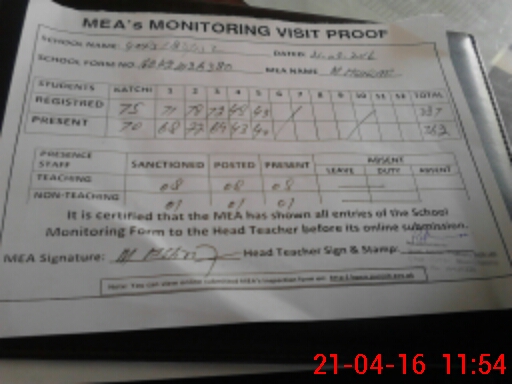| Attendance Register | Head Teacher | MEA with School | Visit Proof |