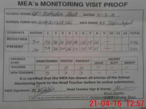 | Certified that this School was Inspected by the Undersigned MEA/DMO Today and the Information Stated Above is as Per Record. | |||||