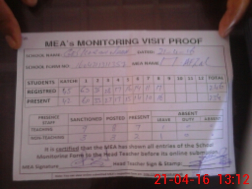 | Attendance Register | Head Teacher | MEA with School | Visit Proof |