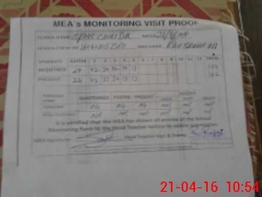 | Attendance Register | Head Teacher | MEA with School | Visit Proof |