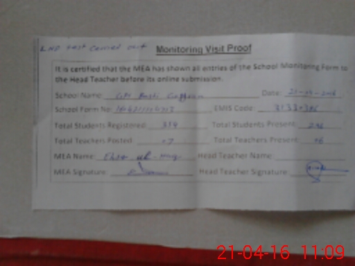 | Attendance Register | Head Teacher | MEA with School | Visit Proof |
