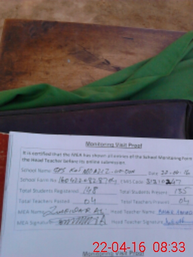 | Attendance Register | Head Teacher | MEA with School | Visit Proof |