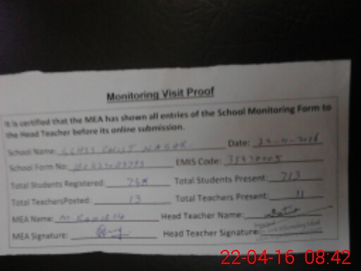 | Attendance Register | Head Teacher | MEA with School | Visit Proof |