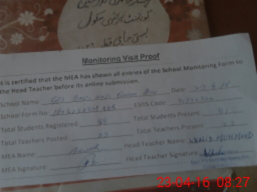| Attendance Register | Head Teacher | MEA with School | Visit Proof |