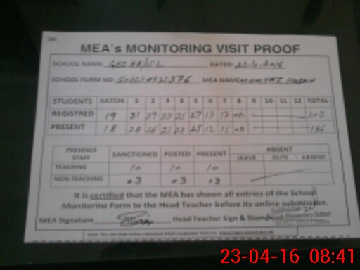 | Attendance Register | Head Teacher | MEA with School | Visit Proof |