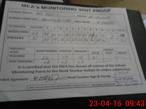 | Attendance Register | Head Teacher | MEA with School | Visit Proof |