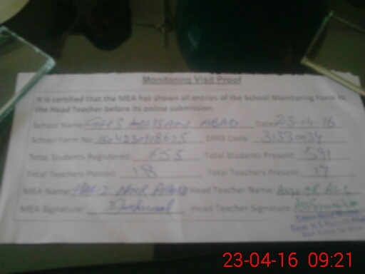 | Certified that this School was Inspected by the Undersigned MEA/DMO Today and the Information Stated Above is as Per Record. | |||||