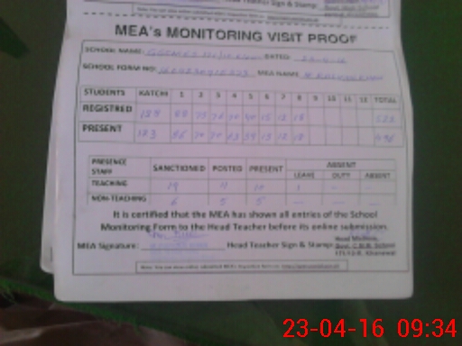 | Attendance Register | Head Teacher | MEA with School | Visit Proof |