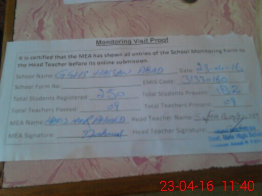 | Certified that this School was Inspected by the Undersigned MEA/DMO Today and the Information Stated Above is as Per Record. | |||||