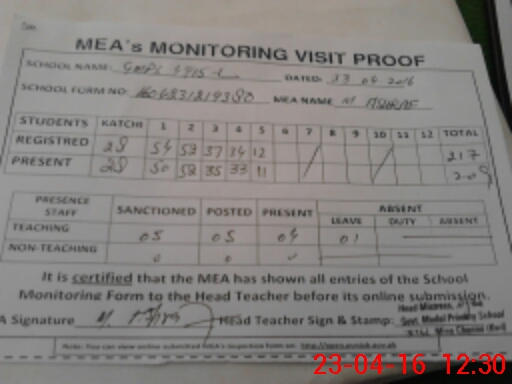 | Attendance Register | Head Teacher | MEA with School | Visit Proof |