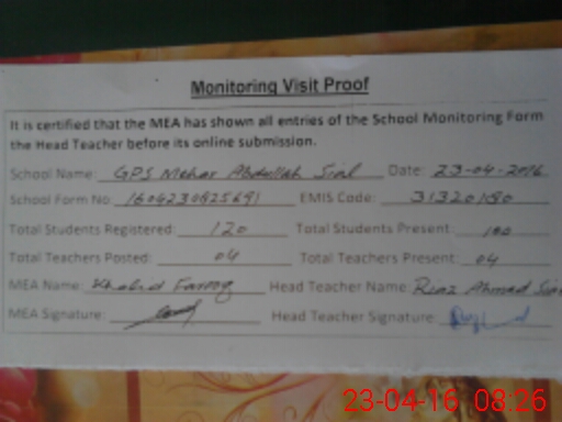 | EMIS Code: 31320180 | Name of School: GPS MAHAR ABDULLAH SIAL | |||