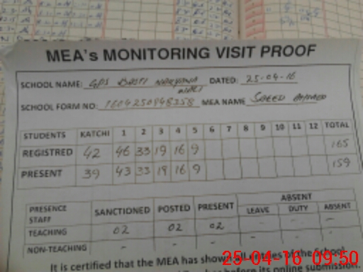 | Attendance Register | Head Teacher | MEA with School | Visit Proof |
