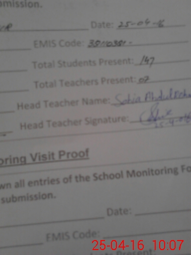 | Attendance Register | Head Teacher | MEA with School | Visit Proof |
