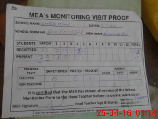| Attendance Register | Head Teacher | MEA with School | Visit Proof |