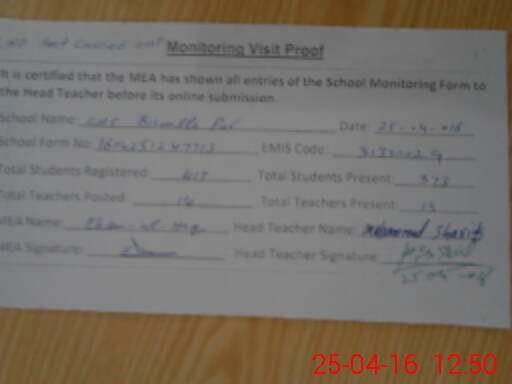| EMIS Code: 31330029 | Name of School: GHS BISMILLAH PUR | |||
