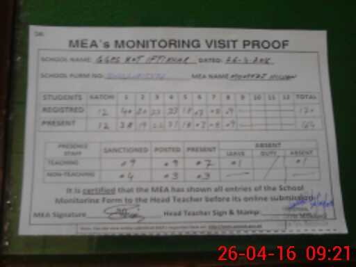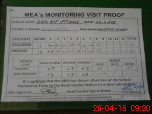 | Attendance Register | Head Teacher | MEA with School | Visit Proof |