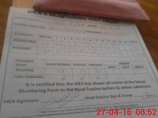 | Attendance Register | Head Teacher | MEA with School | Visit Proof |