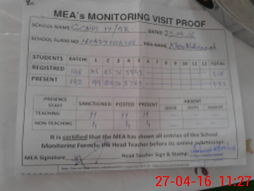 | Attendance Register | Head Teacher | MEA with School | Visit Proof |