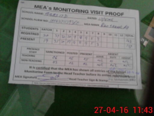 | Attendance Register | Head Teacher | MEA with School | Visit Proof |