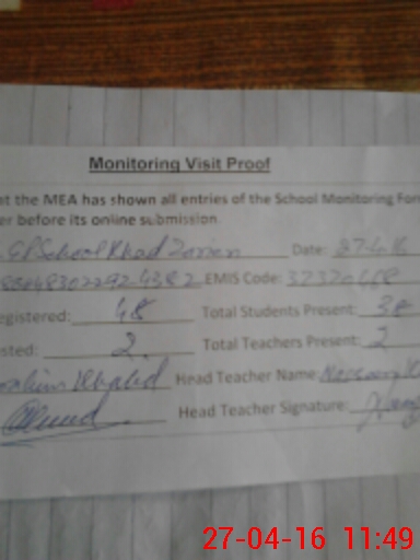 | Attendance Register | Head Teacher | MEA with School | Visit Proof |