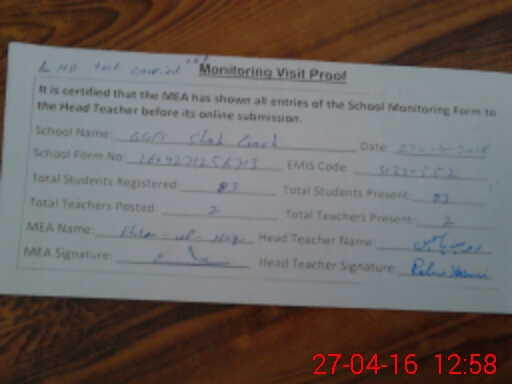 | Attendance Register | Head Teacher | MEA with School | Visit Proof |