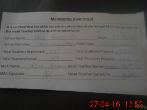 | Attendance Register | Head Teacher | MEA with School | Visit Proof |