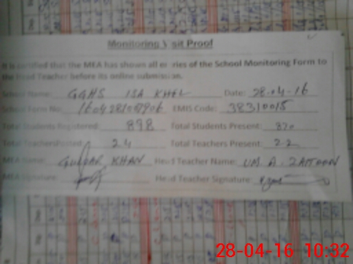 | EMIS Code: 38310015 | Name of School: GGHS ISA KHEL | |||