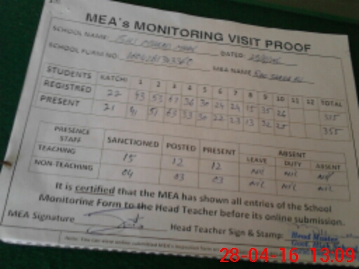| Attendance Register | Head Teacher | MEA with School | Visit Proof |