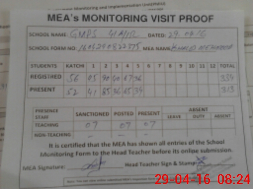 | Attendance Register | Head Teacher | MEA with School | Visit Proof |
