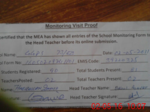 | School Visited by School Health & Nutrition Supervisor (No. of Visits) | 1 | Name1: | MUSHTAQ AHMED DOGAR | Name2: | |