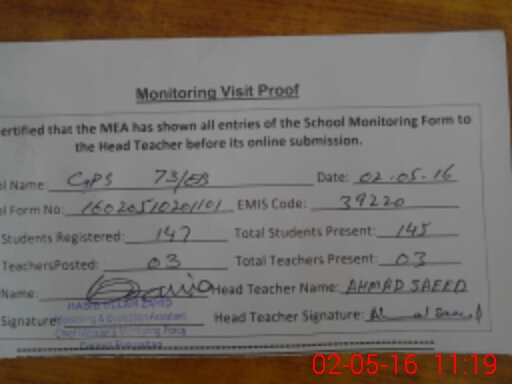| School Visited by School Health & Nutrition Supervisor (No. of Visits) | 1 | Name1: | MUSHTAQ AHMED | Name2: | |