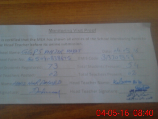 | Attendance Register | Head Teacher | MEA with School | Visit Proof |