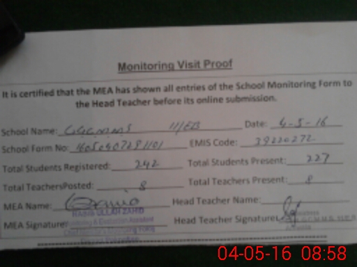 | Attendance Register | Head Teacher | MEA with School | Visit Proof |