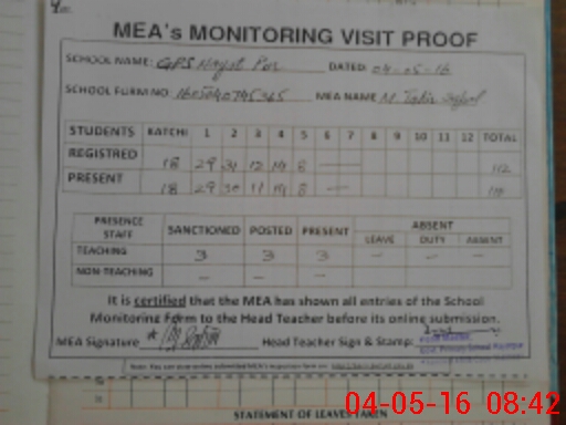 | Attendance Register | Head Teacher | MEA with School | Visit Proof |