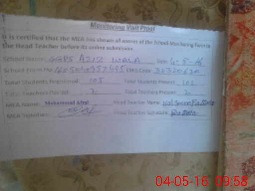 | EMIS Code: 32320620 | Name of School: GGPS AZIZ WALA | |||