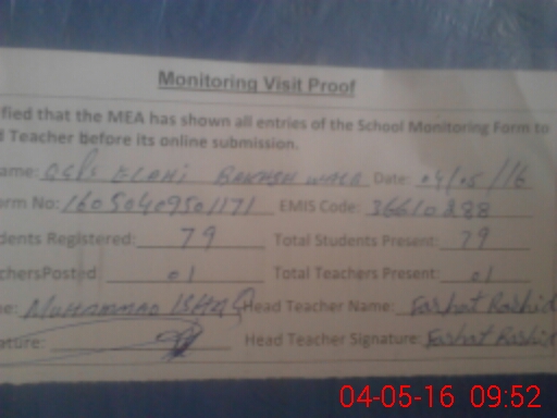 | Name: No**** Iq**** Designation: (School Headmaster's/Headmistress's) PST Phone/Cell Number: 03**** |
