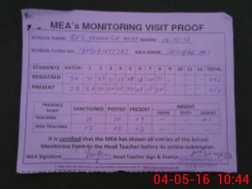 | Attendance Register | Head Teacher | MEA with School | Visit Proof |