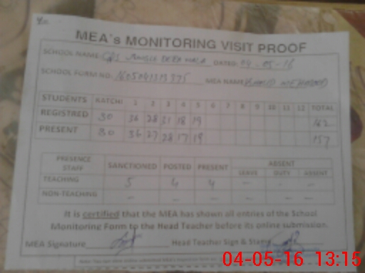 | Attendance Register | Head Teacher | MEA with School | Visit Proof |